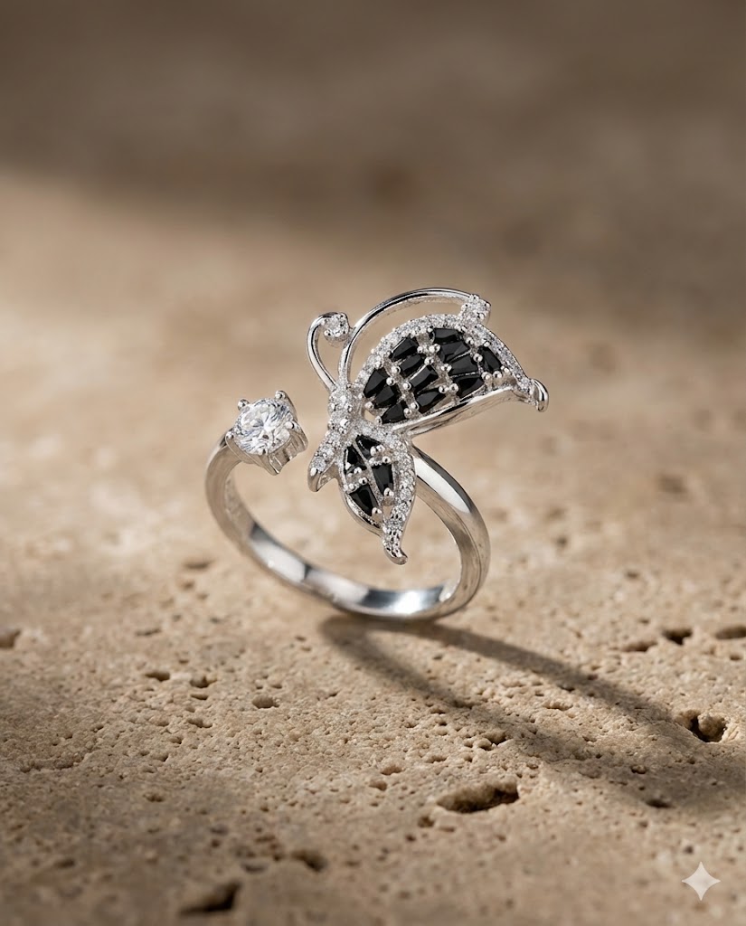 Este anillo captura la delicadeza de una mariposa con circonias cúbicas transparentes y negras que aportan profundidad y un brillo lujoso.