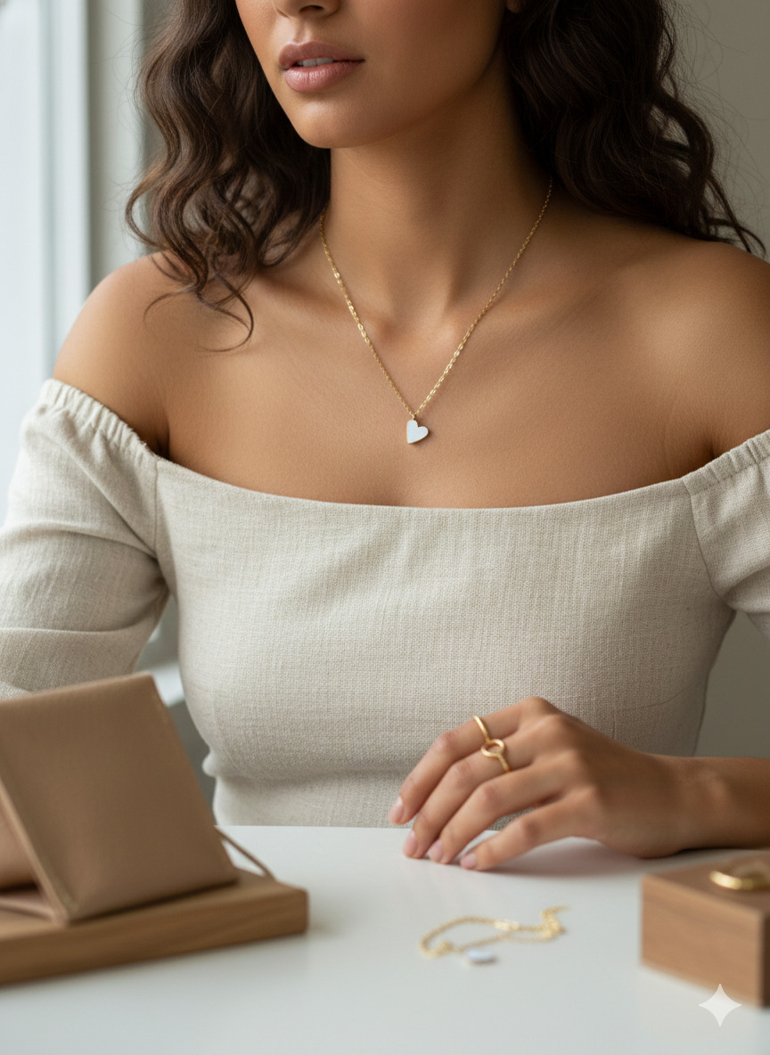 Amor a primera vista. El collar Valentina combina la delicadeza de una fina cadena dorada con un sutil corazón blanco esmaltado. Es esa pieza minimalista y romántica perfecta para elevar tus looks diarios o para combinar en capas.